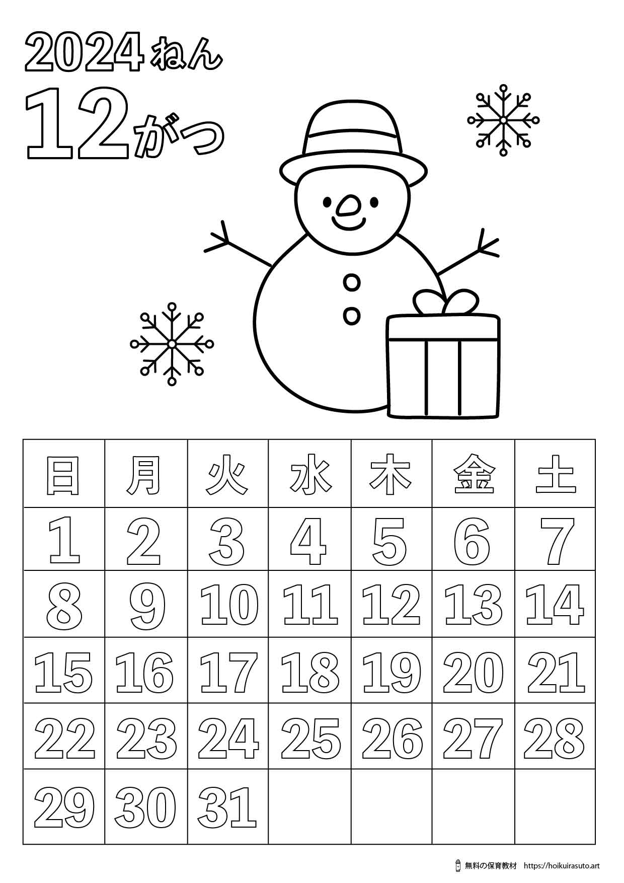 2024年12月カレンダー 塗り絵カレンダー ひらがなカレンダー カレンダーイラスト 冬 ほいくいらすと モノクロ 白黒 塗り絵 保育教材 保育園 介護施設 高齢者 デイサービス 無料ダウンロード 無料イラスト 無料カレンダー プリント  coloring calendar 冬のイラスト  12月のイラスト サンタクロースイラスト クリスマスイラスト ツリーイラスト ベルイラスト 雪だるまイラスト