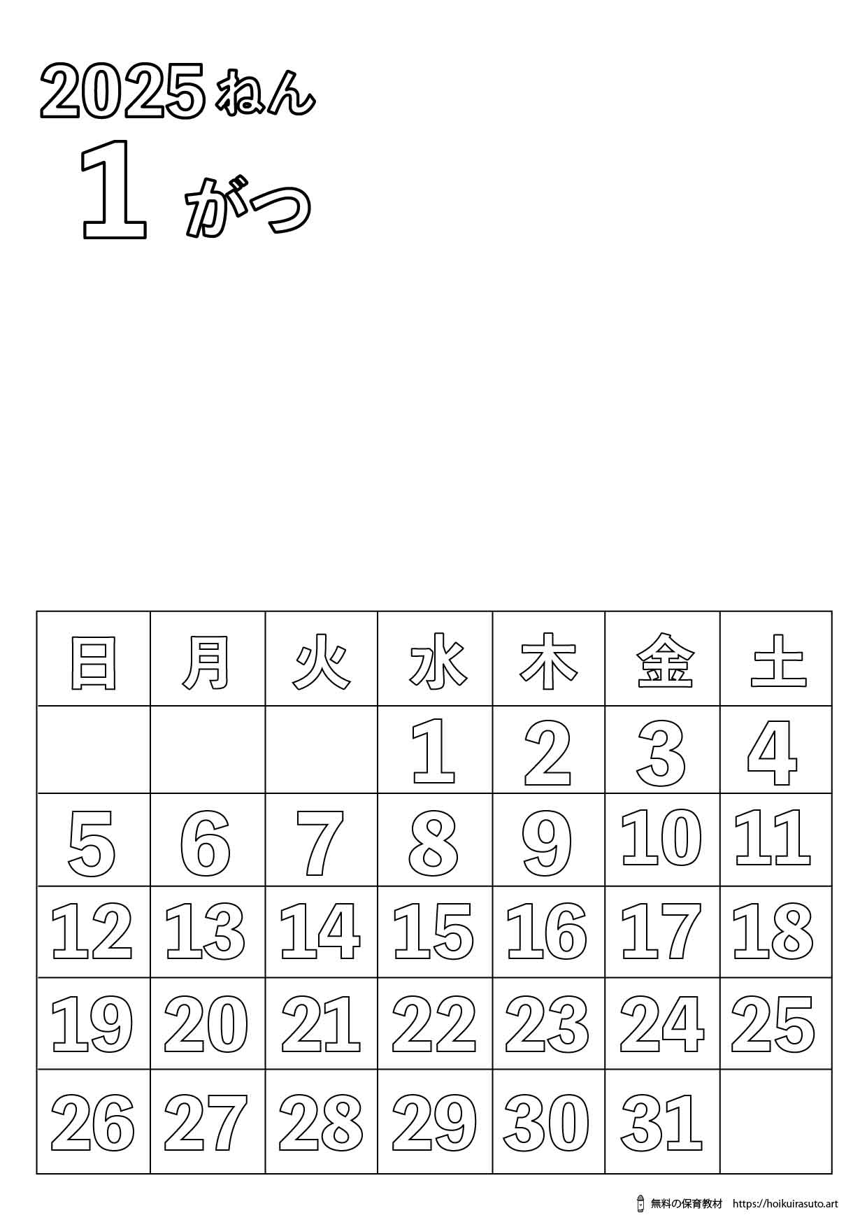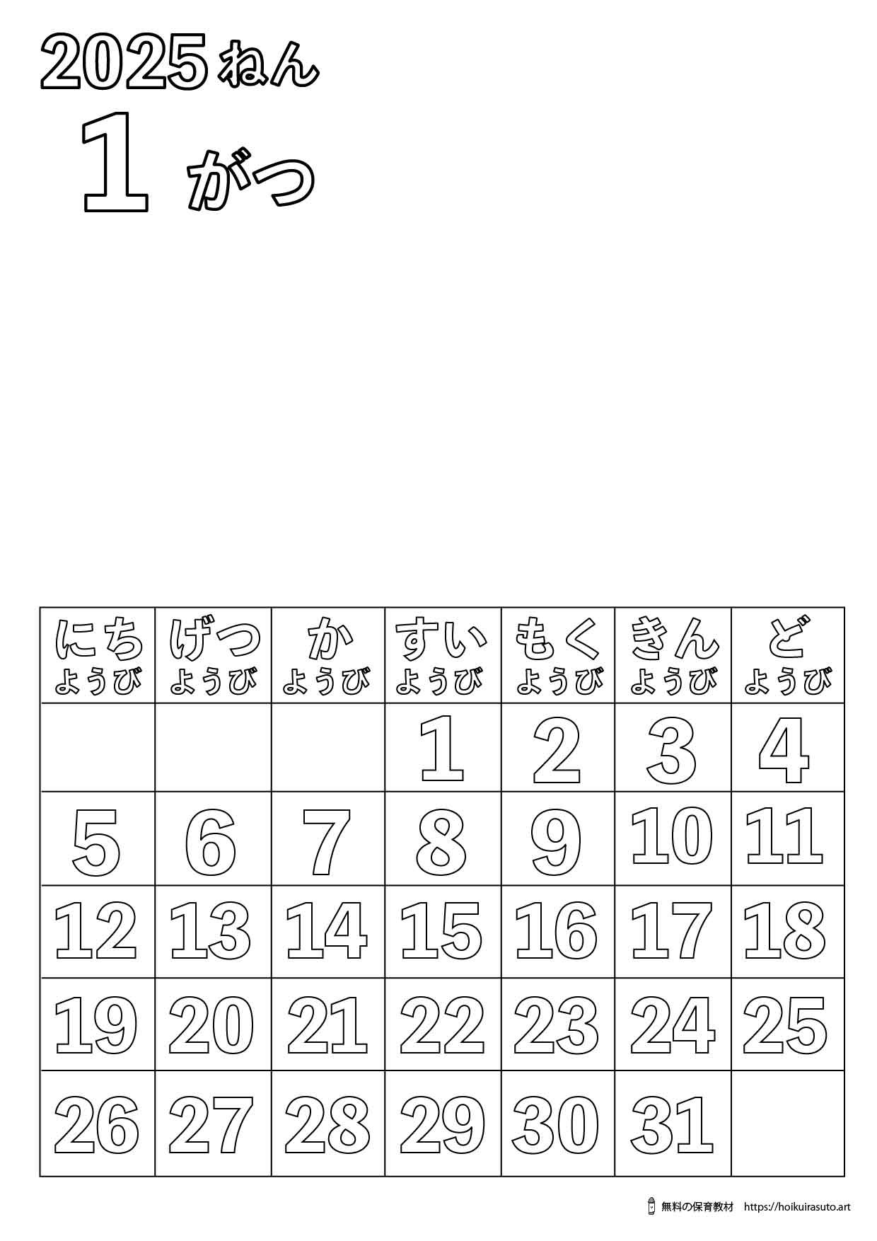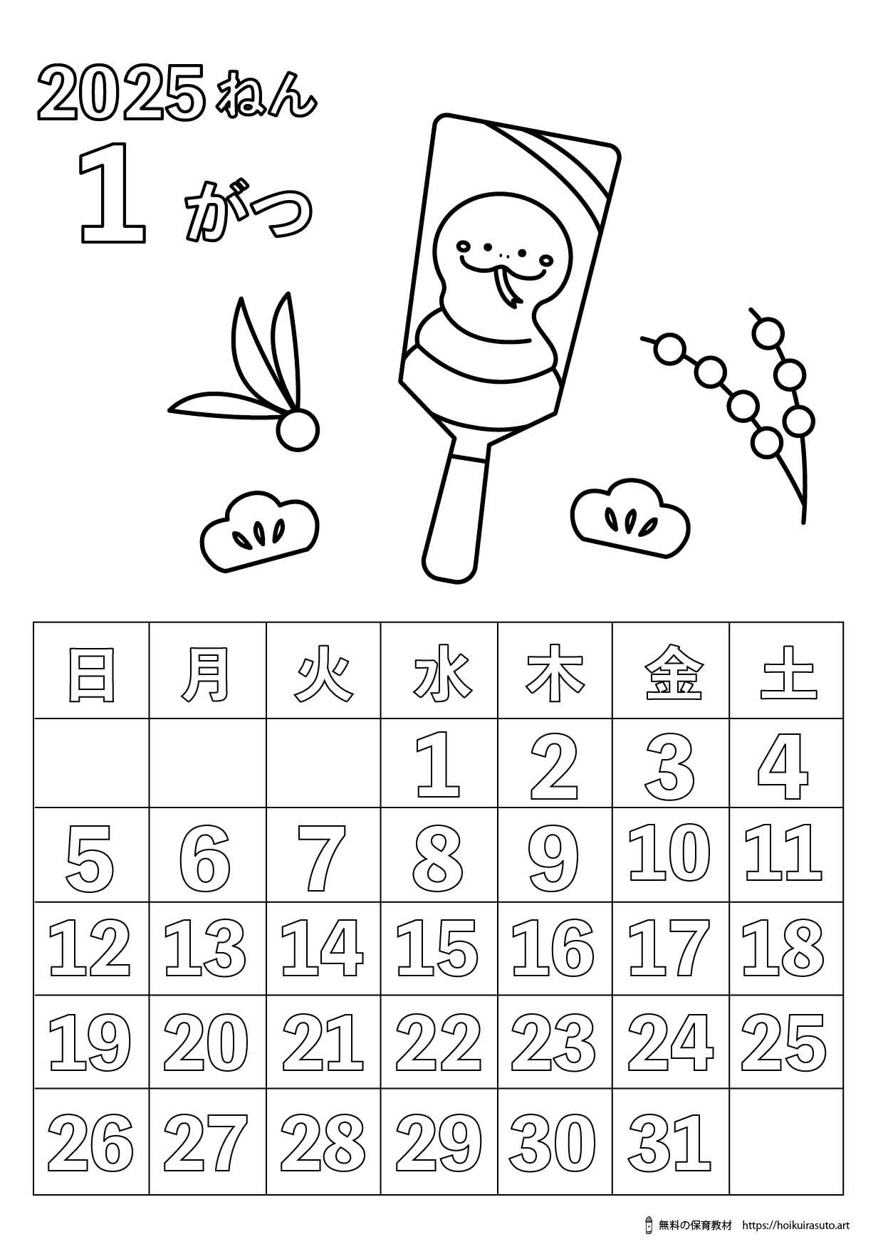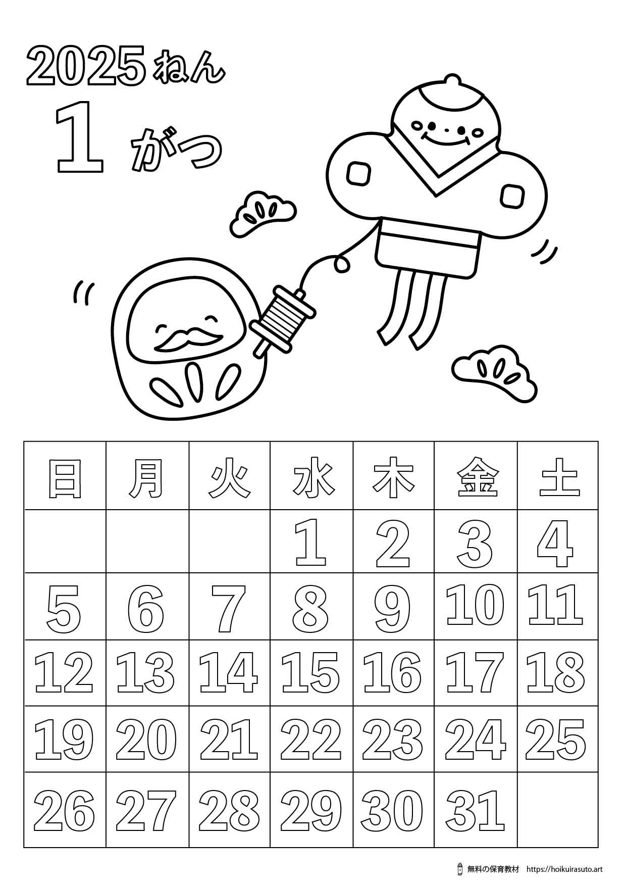 2025年1月 イラスト塗り絵カレンダー ひらがなバージョン
