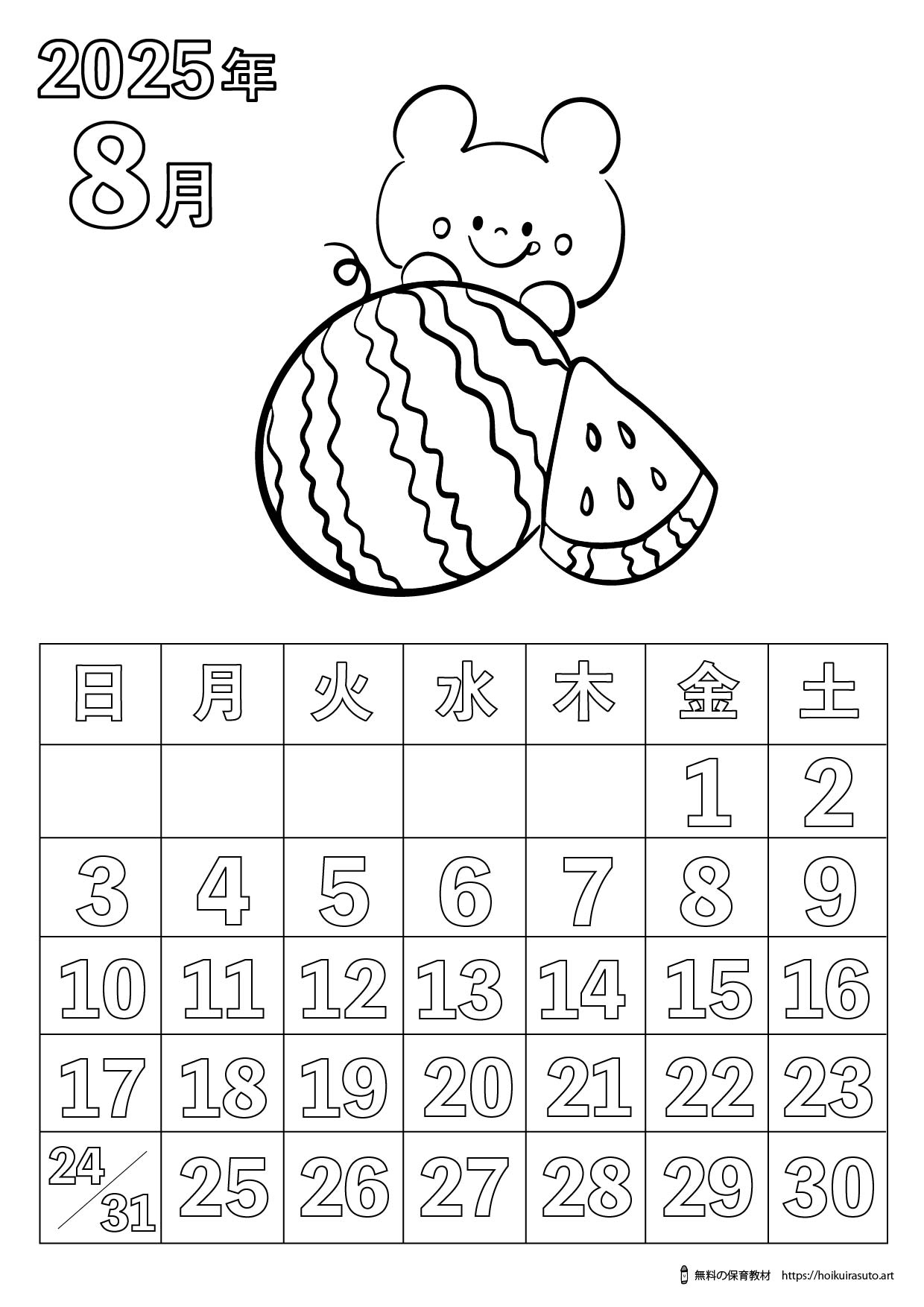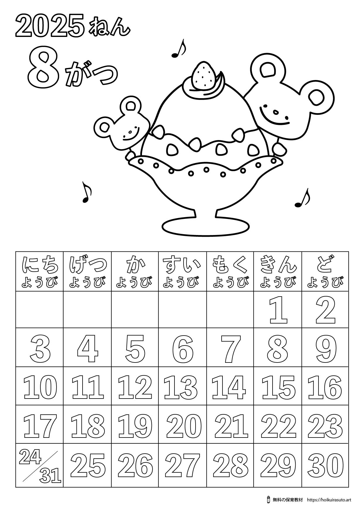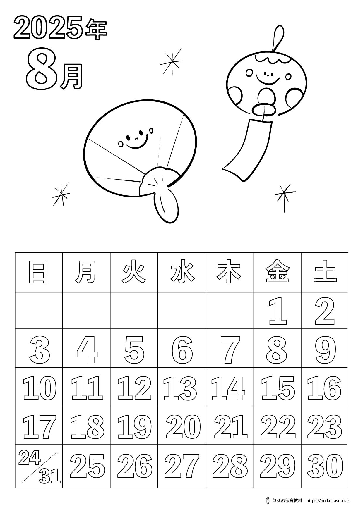 塗り絵カレンダー2025年8月 ひらがなバージョン
