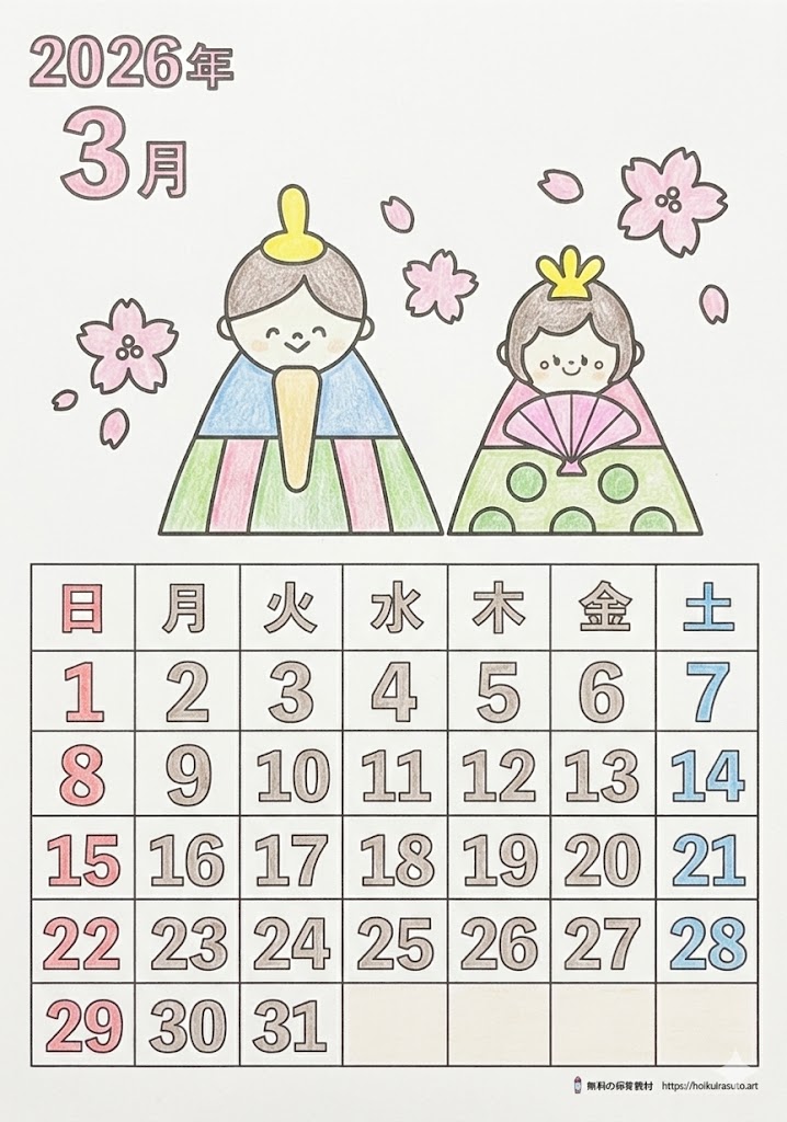 2026年3月【カレンダー塗り絵】無料ダウンロード
