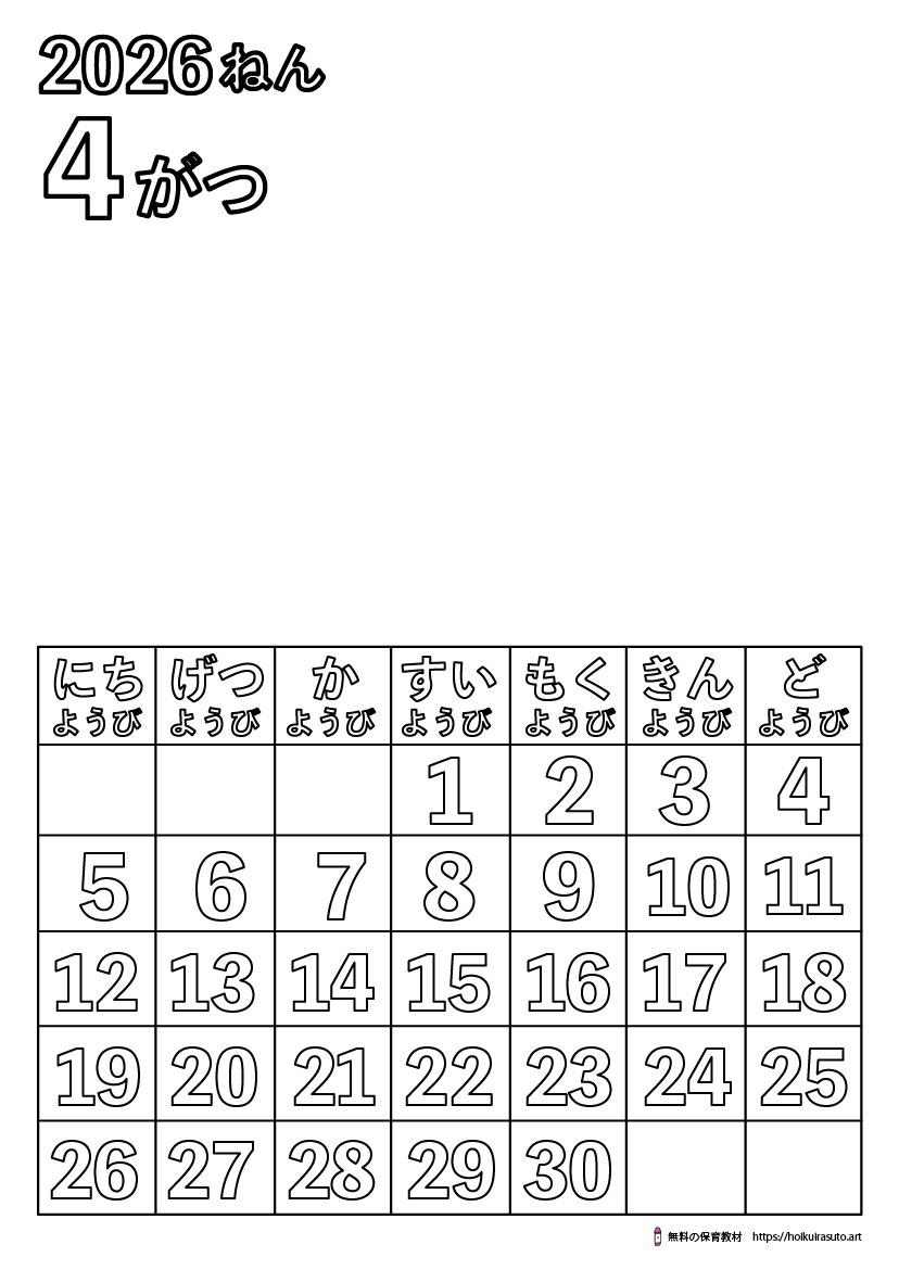 塗り絵カレンダー2026年4月 ひらがなバージョン