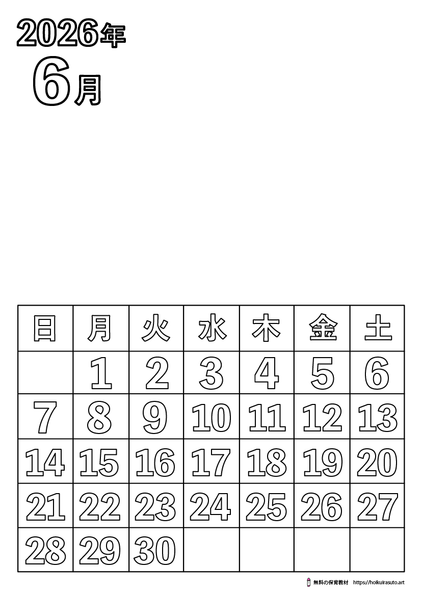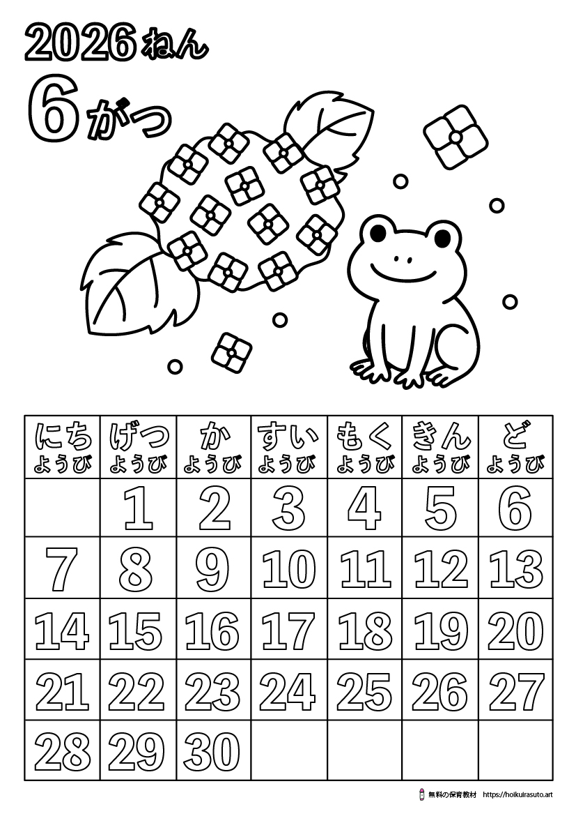 このページでは、2026年6月(令和8年)の塗り絵カレンダーを無料でダウンロードできます。