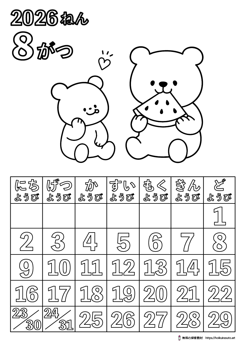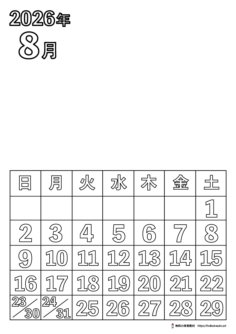 このページでは、2026年8月(令和8年)の塗り絵カレンダーを無料でダウンロードできます。