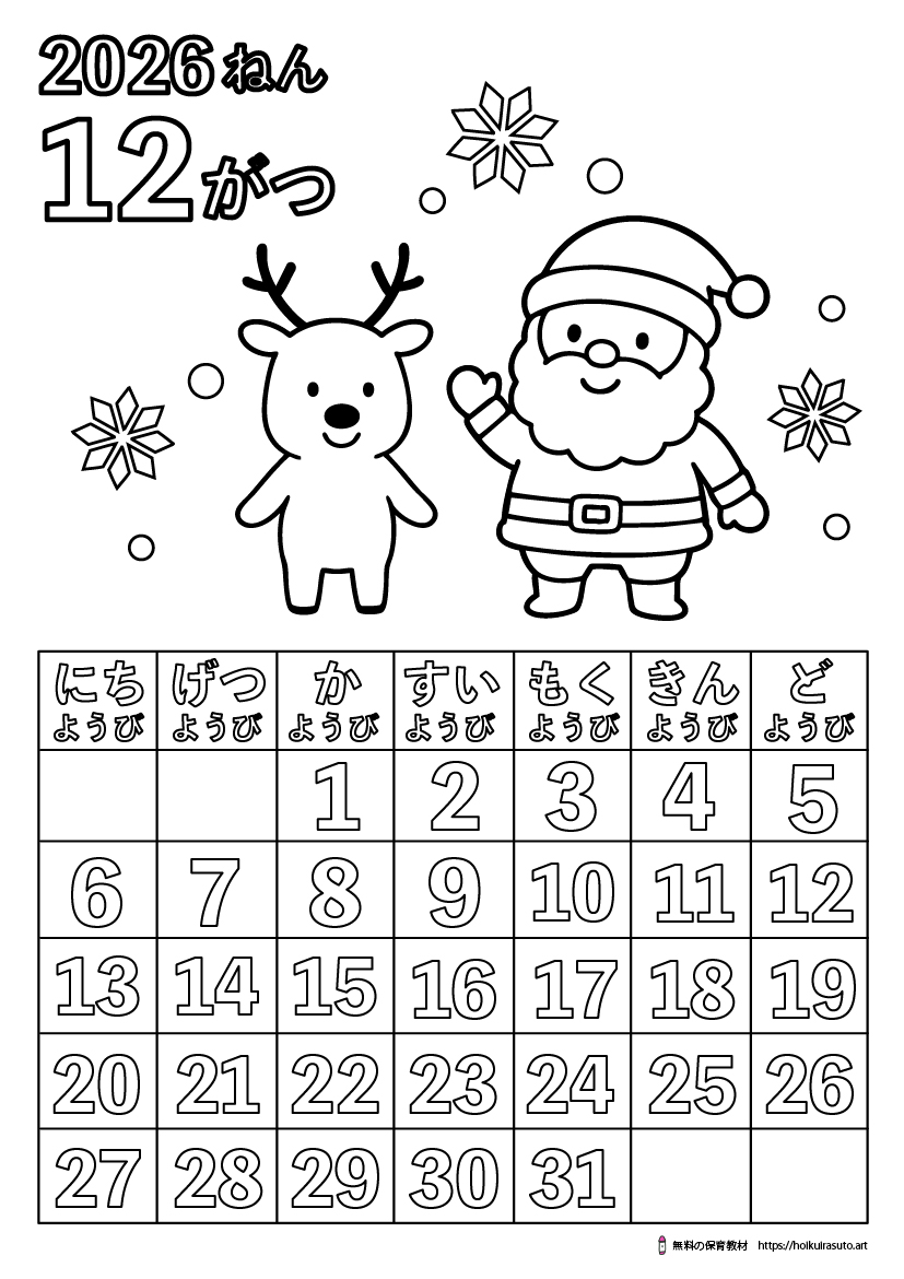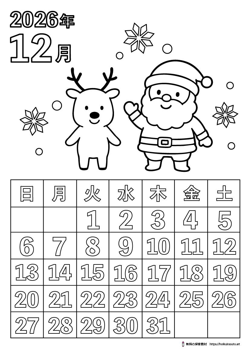 このページでは、2026年12月(令和8年)の塗り絵カレンダーを無料でダウンロードできます。