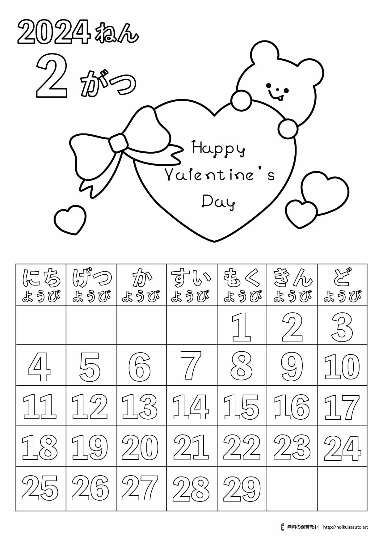 2024年1月6日 / 最終更新日時 : 2024年1月6日 kureyonchan 2024年2月塗り絵カレンダーひらがなバレンタイン&くま [featured_image] ダウンロード Download is available until [expire_date] バージョン ダウンロード 2770 ファイルサイズ 178.00 KB ファイル数 1 投稿日 2024年1月6日 最終更新日時 2024年1月6日 2024年2月塗り絵カレンダーひらがなバレンタイン&くま